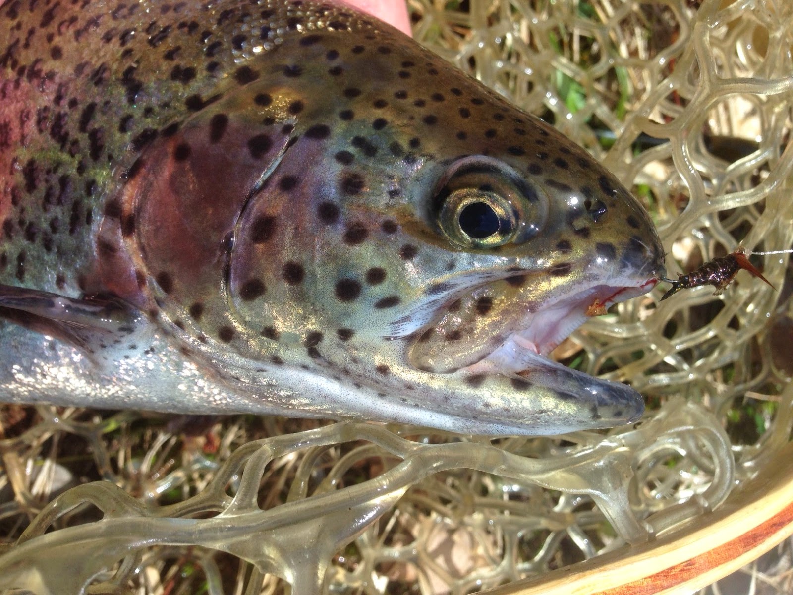 Two drifts later, I hooked up again, this time losing a nice rainbow when it became entangled in about 40 yards of submerged yellow braided line and broke me off. I switched flies, this time to a size 22 caddis larvae. Same results. They would crush every microscopic nymph I drifted by them and then find their freedom on some underwater hazard. After six lost fish and numerous hits, I finally got a gorgeous 15-inch rainbow to net on a size 18 sparkle caddis pupa and was overcome with relief.