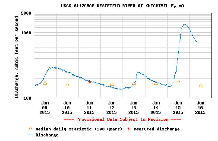 I am getting ready to fish, and with much-needed rain coming, I know many rivers will be pretty swollen. For example, here is a recent chart showing flows of the Westfield River below Knightville Dam: