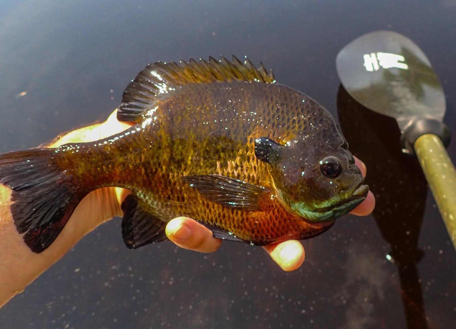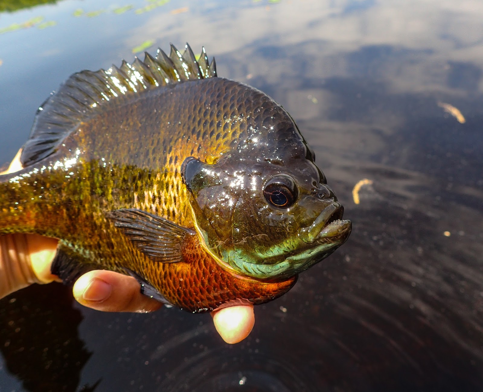 This is a frustrating time of year for the freshwater fly angler. I only say that because there are so many different opportunities to catch a variety of species on fly – invariably if you decide to fish for warmwater species you are missing out on some excellent trout angling, and vice-versa. Today I decided to chase fish of the warmwater variety. I’m a bit obsessed with big, tank-sized bluegills…you know the ones, you can’t fit your hand around them, their forehead juts out like a Neanderthal. Very cool looking fish in my opinion. They are super fun to catch on fly and this time of year, when they are on their beds, is really the only time I go after these guys. Finding them and catching them consistently has always been a bit of a hit-or-miss proposition for me. Populations of big bluegills need the right combination of abundant food and the right mix of predators to limit their density. Populations of large bluegills are easily overharvested mainly because of lower abundance coupled with the amount of time it takes for the fish to reach a large size.