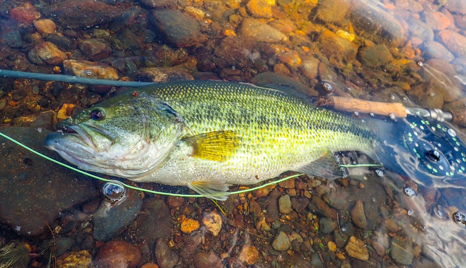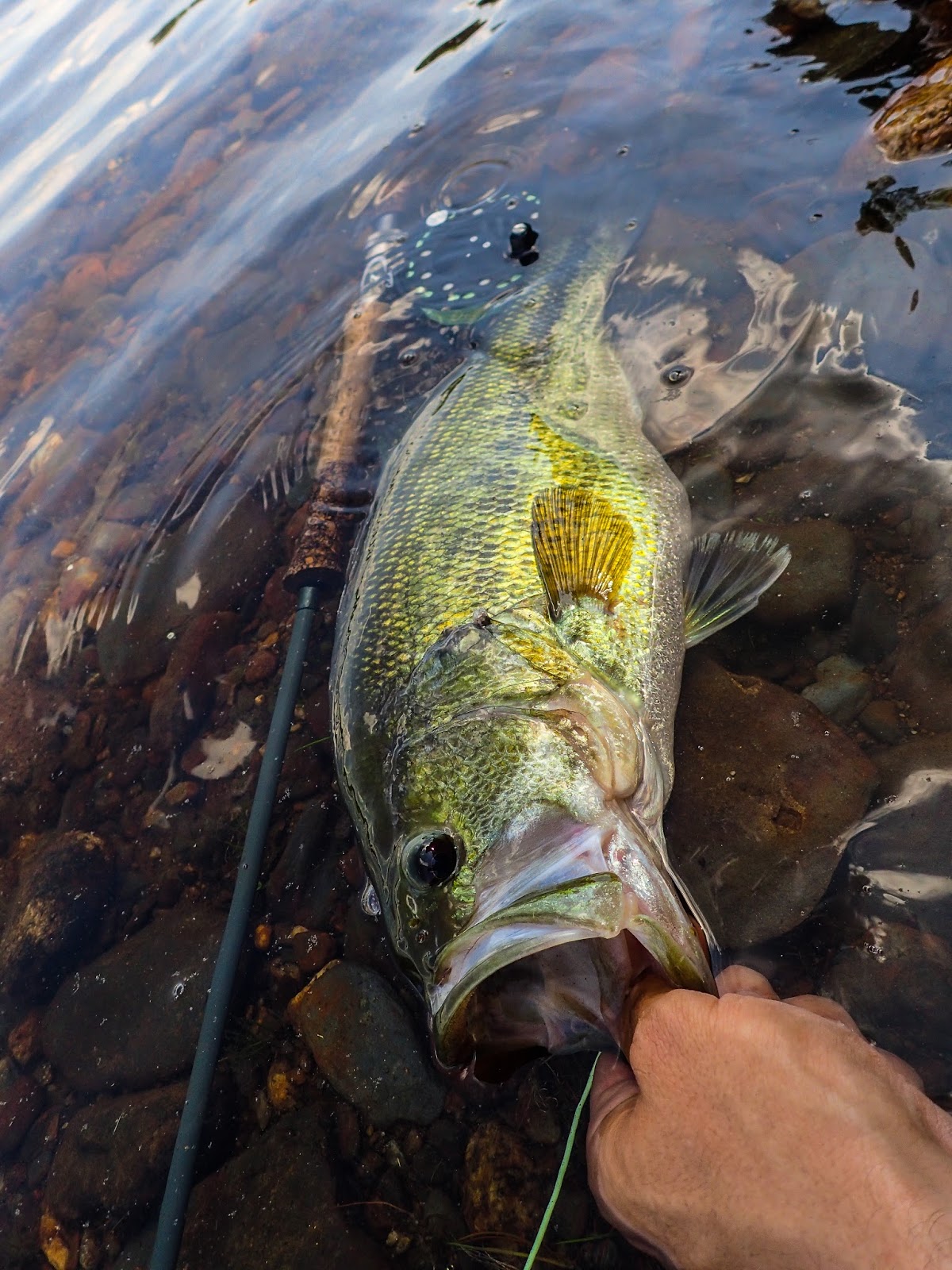 After the morning bluegill fishing I decided to head over to Wachusett to see if I could spot any bass in shallow. I fished a brown and orange cone-head streamer. I figured the fish would see it as either a sculpin or a crayfish. Covering my bases. I picked up a few decent size rock bass, some miniature smallmouth bass, and even a couple big bluegills. The sunfish are all bedded up. This time last week there was almost no activity in the shallow bays I was exploring on Wachusett. What a difference a week of warm weather makes. I walked the shoreline awhile looking for bass cruising or sitting on beds. I didn’t see much. I spotted one solitary piece of wood sticking up from about 4-6 feet of water about 15 yards off shore. I knew that any bass in the area had to be interested in that cover. I was right. When I got close I saw what I thought was a pretty good fish finning lazily right at the base of the log. I cast in and he hit right on the drop. Hard-fighting, jumps and head shakes, all the things largemouth are known for. A really good fish. I didn’t have a tape but I’d guess that he was a legit 18-20″ fish with a pretty healthy girth. As far as I know Wachusett doesn’t have a huge population of largemouths but it does produce fish of good average size.