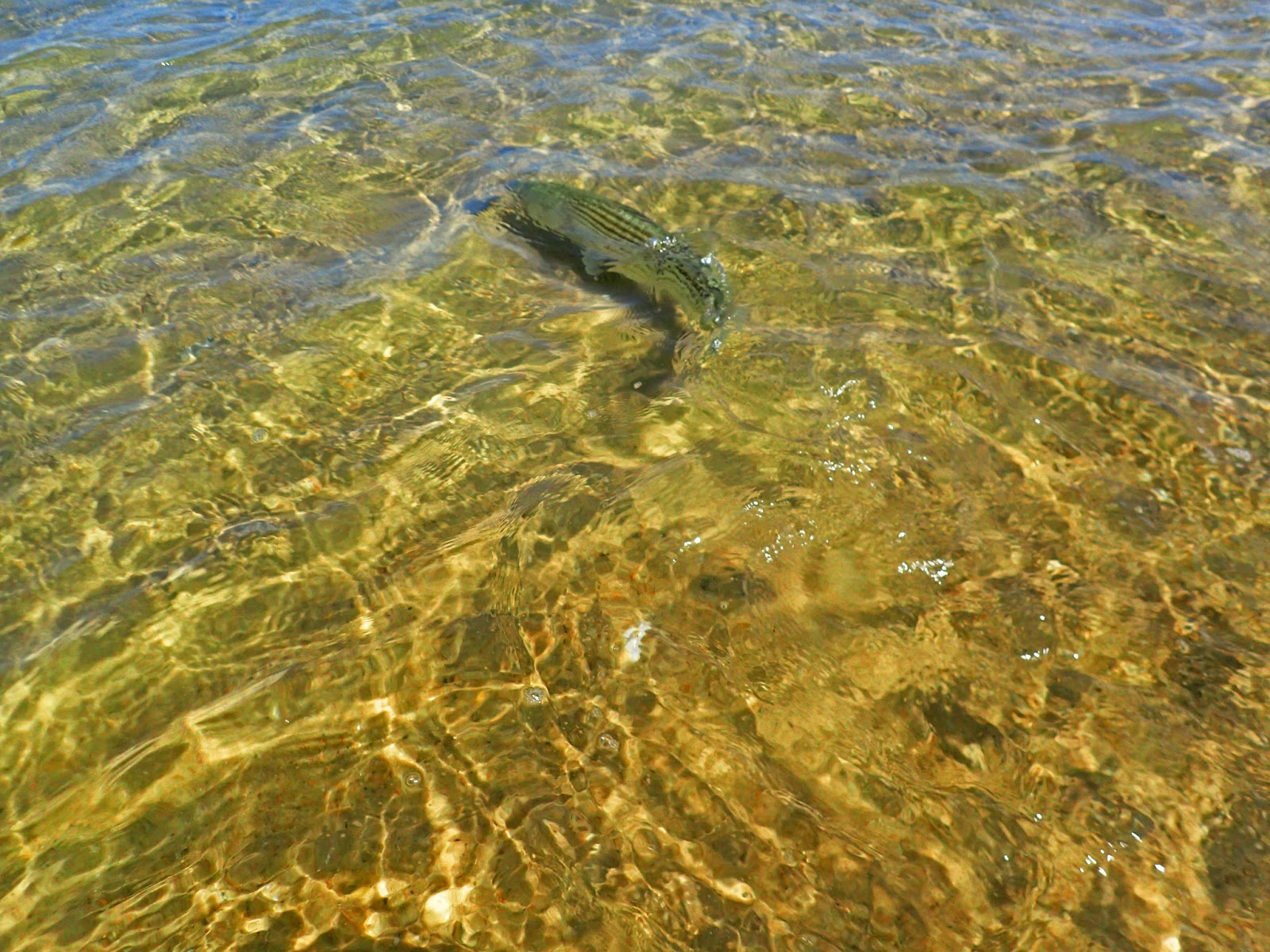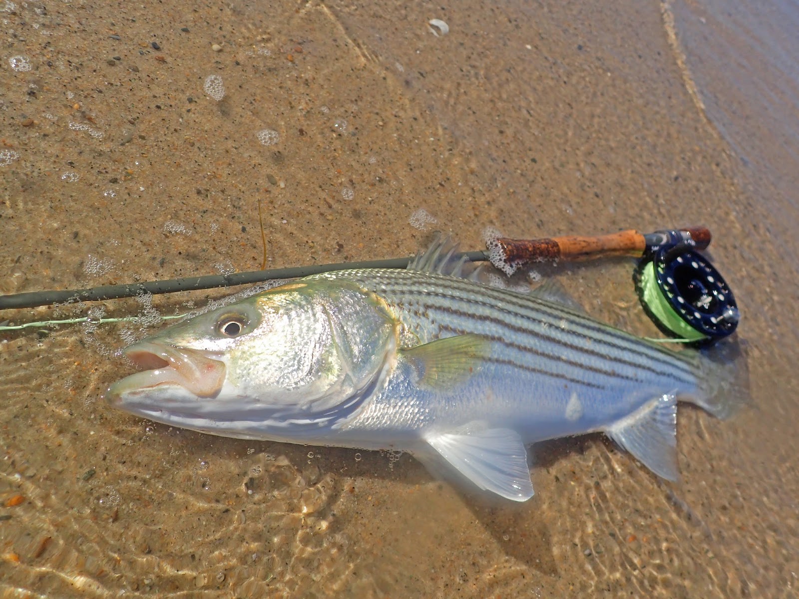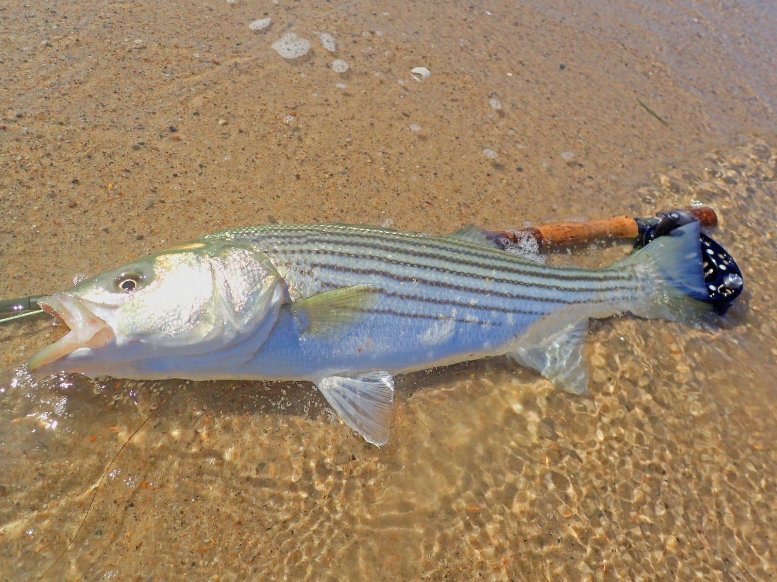A bit later as the tide began to rise I was wading in the bare white sand just of the edge of an extensive eel grass area. As the water crept up striped bass literally started pouring out onto the flat from the deeper grass, turning parallel and following the grass edge. I had a nearly continuous flow of fish to cast to for the next hour. Fish in groups were pretty aggressive while single fish tended to shy away from my presentation for the most part. Unfortunately the singles also tended to be the larger individuals. The tide continued to rise and I moved away from the grass edge in extensive, bare, sandy flats. Stripers just kept coming by in waves. It was unreal. Conditions were perfect and I could spot them cruising along like packs of wolves hunting sand eels and whatever else was out there. It was pretty much like this all the way through high tide and even continued as the tide started falling. At one point I stood in one spot while a huge pack of stripers made a big circle near me. I’d cast out and catch one and by the time I landed and released it the pack would be completing its circuit and be headed my way again. Catch, land, release, repeat.