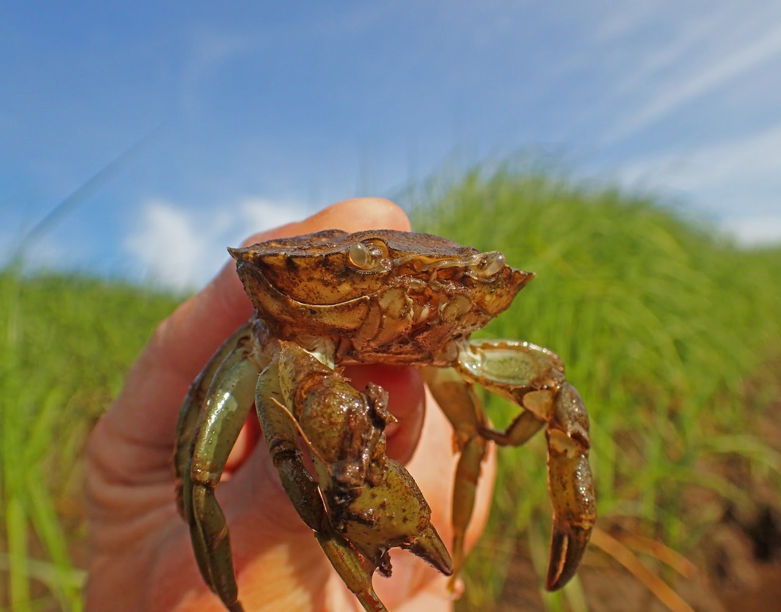 It was high tide when I launched so it was a short carry to the water. I’m glad I brought waders though, the water was a chilly 55 degrees. First off I headed east along the shore and checked out the Mill River estuary to see if I could spot any fish cruising around in the flooded grass. Nothing going on but a pretty sweet spot. I’m sure there are fish in there during particular times/tides/etc. I’m still learning. Below are a few pics from the Mill River estuary including a cool crab I found (it was dead, I couldn’t catch any of the live ones!).