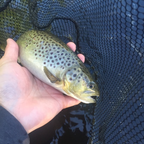 Went 11-for-14. Landed one baby smallmouth, and five rainbows and five browns. They were feasting on small bugs.