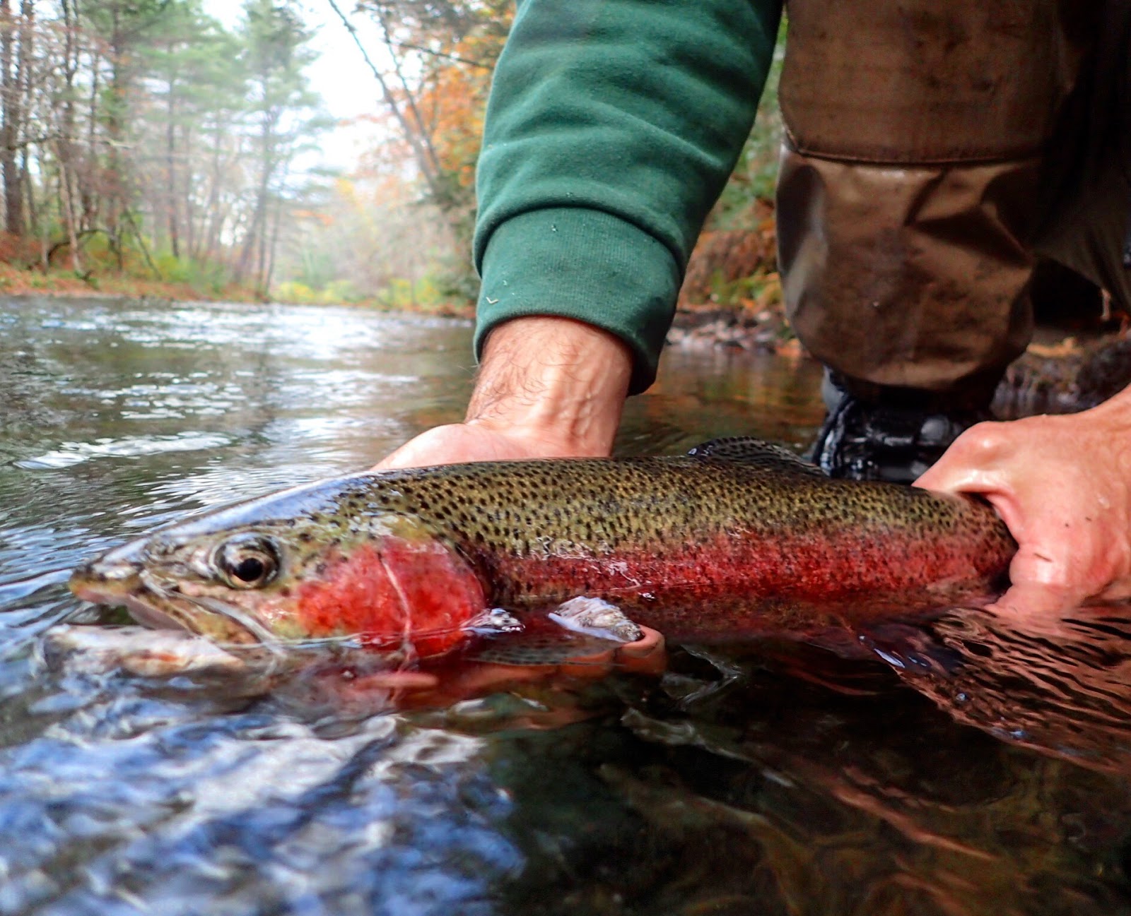 Hit up the Swift this afternoon for a couple hours after work. It did not disappoint. The fish were on and aggressive. The rainbows were up on shallow gravel and losing their minds. I’ve heard that one of the rainbow strains stocked by the state are fall spawning fish – that would certainly explain the behavior and the color of the males. However, they also could have been simply gorging on brook trout eggs as the brookies are definitely in full spawning mode.