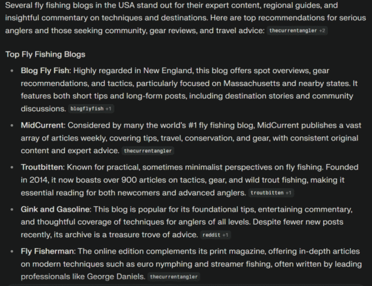 Curious, I asked Perplexity which were the top USA fly-fishing blogs. It mentioned this blog as #1 (source).