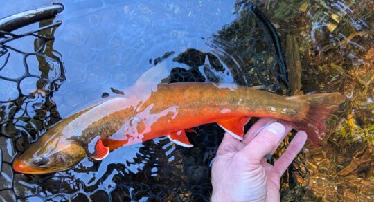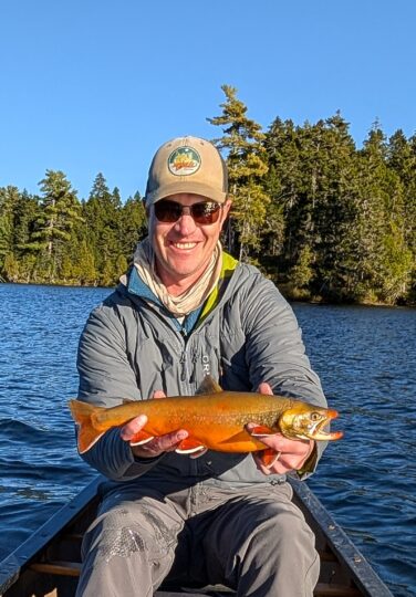 Casting a weighted line is something I am not accustomed to, and the wind and canoe were not doing my efforts any favors.  My fly line tangled up on a cast and I had to work all along the the line to clear the stubborn knots. TJ alertly kept us in position as I worked on my bird’s nest of line, and just as I reached the end of the knot the line went tight and I had a fish on!  The rod doubled over and the fish dug for the bottom.  These fish have a tendency to roll on the line and do some funny things so I was careful in bringing it up towards the boat.  I had to give the fish line multiple times. Each large head shake made the rod and my heart thump.  A brilliant, almost unnaturally bright red and orange burst of color suddenly appeared and I had caught my first landlocked Artic Char- a male colored up for spawning season.   I was in awe.