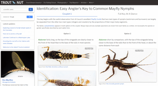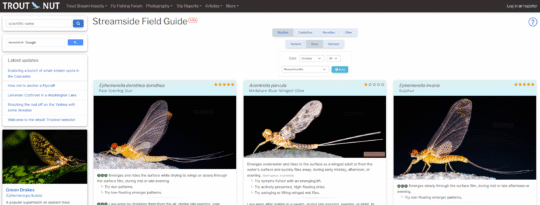 Jason: My favorite new feature is the streamside field guide. Those of us without microscopes for eyes don’t have the time or ability to look at the true identifying characteristics of most insects (tiny mouth parts, hairs, etc.) on the water, so we have to rely on the general look of the bugs at a glance, however imperfect that is. Written field guides get you part of the way there, but most of us don’t carry those in a vest. Also, written guides only have enough paper and ink to cover the most common species, and in my experience (maybe partly due to fishing the West for so much of my life) most of the hatches I see aren’t the big-name ones that appear in books. The stream side field guide on Troutnut gives you all the common species and the obscure ones, matched to your location anywhere in North America. It includes the most relevant bare-bones information to hatch-matching, such as whether a species emerges on the surface or by crawling out on the rocks. There’s limited information available anywhere about many species, so the guide often borrows from related species, but it tells you when it’s doing that.