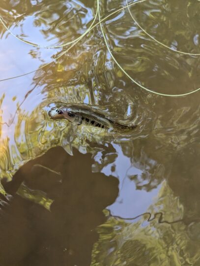 I couldn’t find any sign of insect activity beyond some big damsels and beetles and a few inchworms on the bankside grass. So I did what any sane fisherperson would do and tie on the biggest, Chernobylist-hopper I could cast with my rod (which was still not that big) and proceeded to flog the water with it. This as you could imagine was as unsuccessful as expected right up until I caught a chublike minnow with more ambition than sense. He was the chubby Chernobyl-consuming chub (I have no idea if it was actually a chub or not).