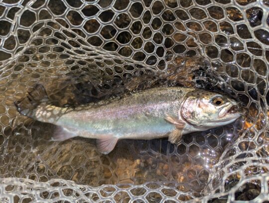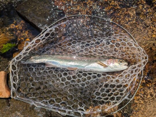 I missed several taps, but eventually, the best fish of the day came tearing out of the darkest part of the hole and hit my fly like a truck on the I-90. This fish gave me several long tearing runs that culminated in a full body exit jump or two before landing it. I didn’t have my measure tape with me but it was as long as the opening of my net. About 14” or so. Not a huge fish but certainly a big one in that creek.